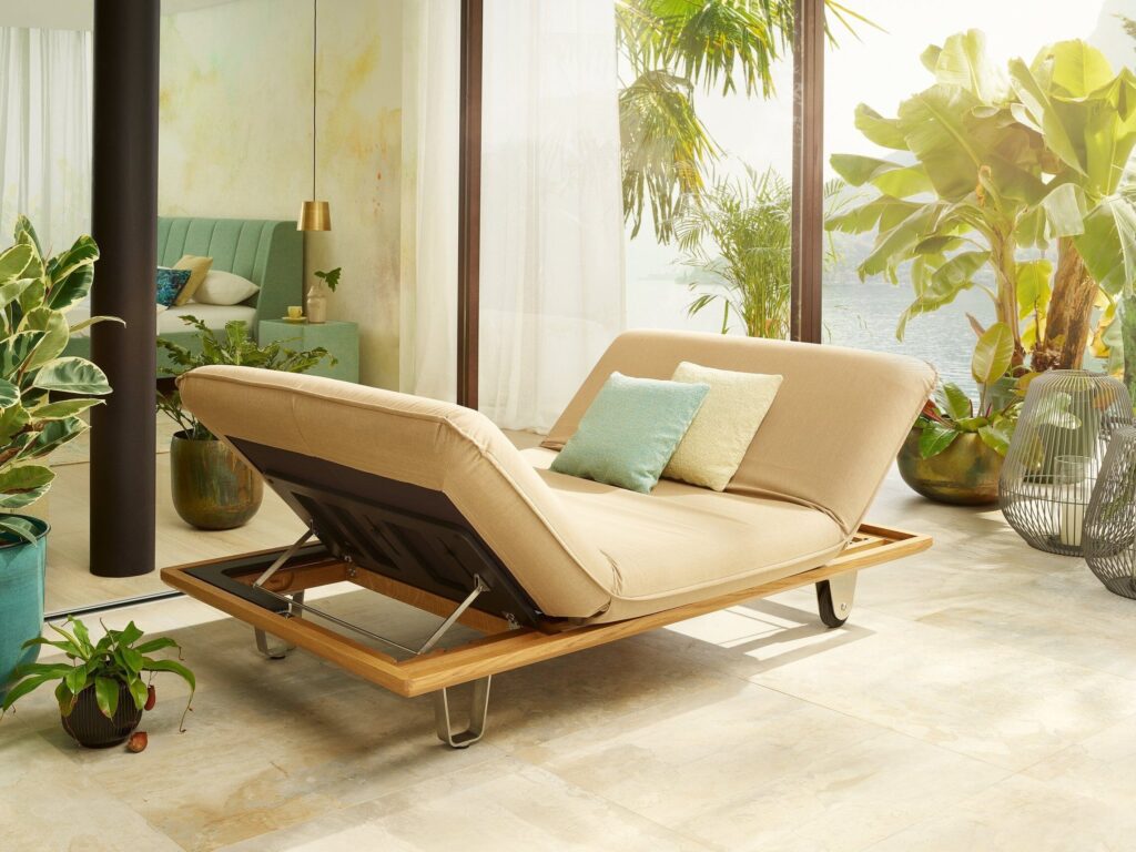 Seit Oktober 2024 stellt Joka auch die hochwertige Outdoorliege Butterfly her. Sie ist verstellbar in drei Richtungen: das Kopfteil der Liege ist beidseitig hochzustellen, ebenso kann die lange Seite als Sofa für die Terrasse genutzt werden.