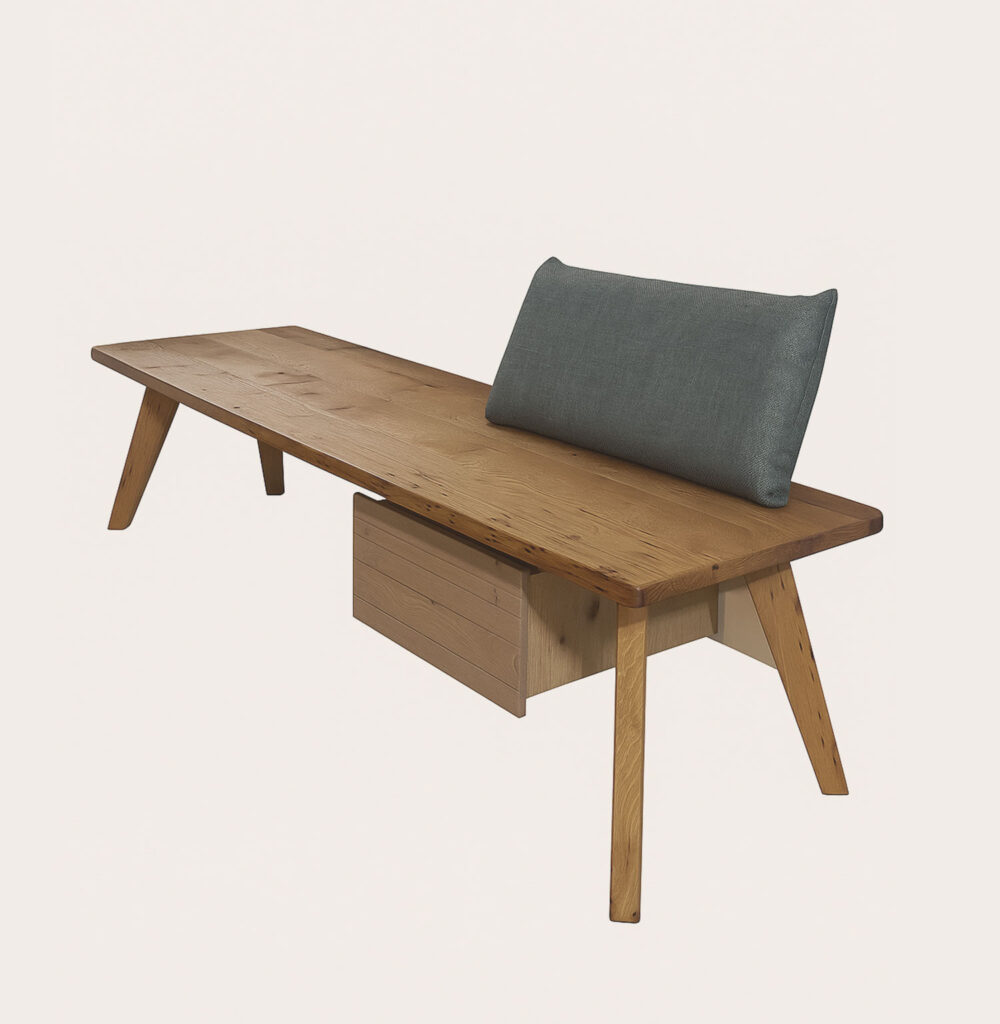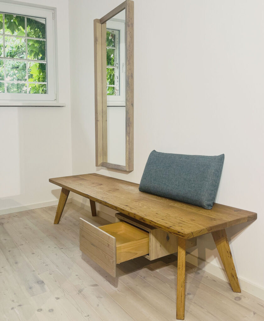 Wie wäre es mit einer schönen Holzsitzbank? Schlicht mit Polsterauflagen oder mit zusätzlichem großzügigem Stauraum in Schubkästen unter der Sitzfläche.